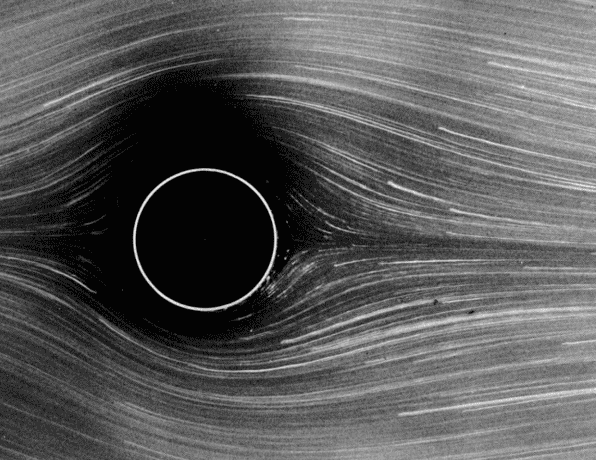 “At this Reynolds number the streamline pattern has clearly lost the fore-and-aft symmetry of figure 6. However, the flow has not yet separated at the rear. That begins at about R=5, though the value is not known accurately. Streamlines are made visible by aluminum powder in water.” Photograph by Sadathoshi Taneda