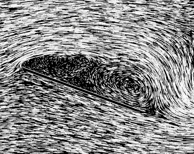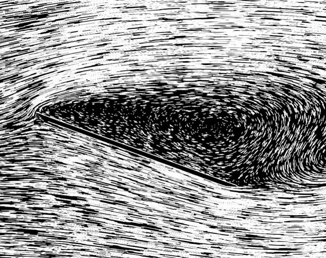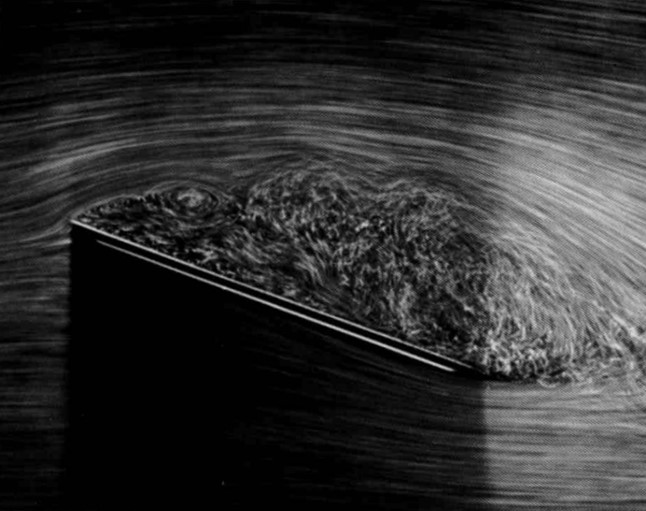 Air bubbles in water show the turbulent flow field around an inclined plate at Reynolds number \(Re = 10000\). At 20\(^{\circ}\) inclination relative to the oncoming flow, the flow fully separates from the entire upper surface of the plate and creates a turbulent wake. The turbulent boundary layer is of highly chaotic and unsteady nature. For comparison, a transient simulation was created in Simcenter StarCCM+ using the SST turbulence model. Photograph by ONERA photograph, Werlé 1974