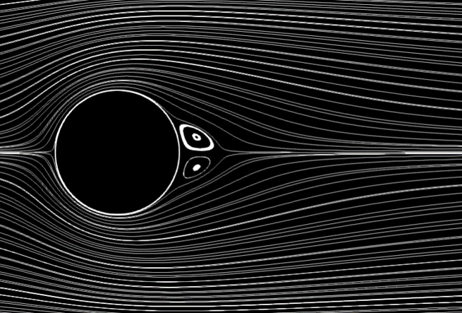 This post is part of a series on flow separation, studied for the case of flow past a circular cylinder at different Reynolds numbers. The current figure is the first figure of this series displaying flow seperation, although the onset of separation should occur for a Reynolds number around 5.