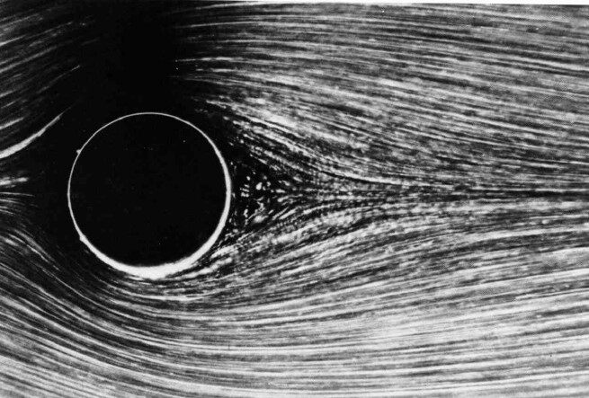 “Here, in contrast to figure 24, the flow has clearly separated to form a pair of recirculating eddies. The cylinder is moving through a tank of water containing aluminum powder, and is illuminated by a sheet of light below the tree surface. Extrapolation of such experiments to unbounded flow suggests separation at R=4 or 5, whereas most numerical computations give R=5 to 7.” Photograph by Sadathoshi Taneda