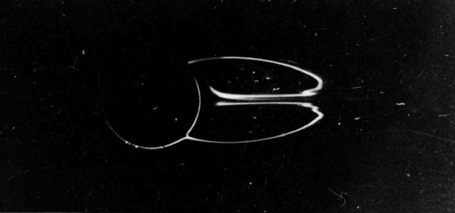 “Here just the boundary of the recirculating region has been made visible by coating the cylinder with condensed milk and setting it in motion through water.” Photograph by Sadathoshi Taneda