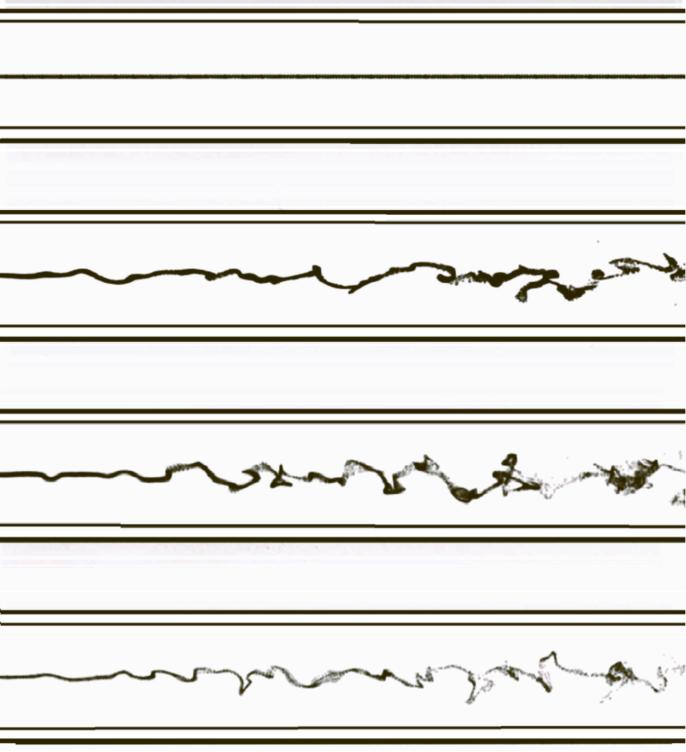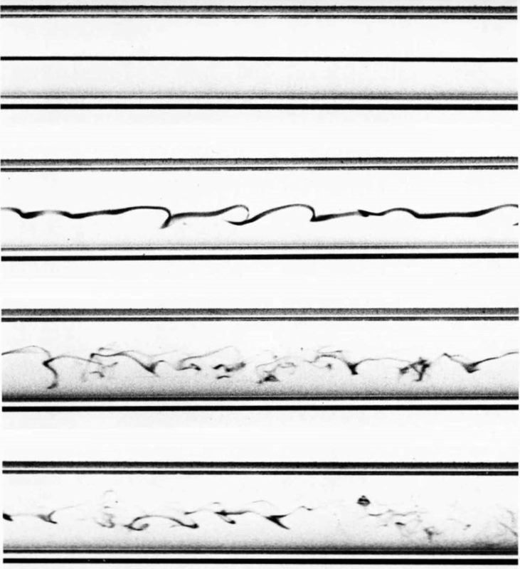 “Osborne Reynolds’ celebrated 1883 investigation of stability of flow in a tube was documented by sketches rather than photography. However the original apparatus has survived at the University of Manchester. Using it a century later, N.H. Johannesen and C. Lowe have taken this sequence of photographs. In laminar flow a filament of colored water introduced at a bell-shaped entry extends undisturbed the whole length of the glass tube. Transition is seen in the second of the photographs as the speed is increased; and the last two paragraphs show fully turbulent flow. Modern traffic in the streets of Manchester made the critical Reynolds number lower than the value 13,000 found by Reynolds.”