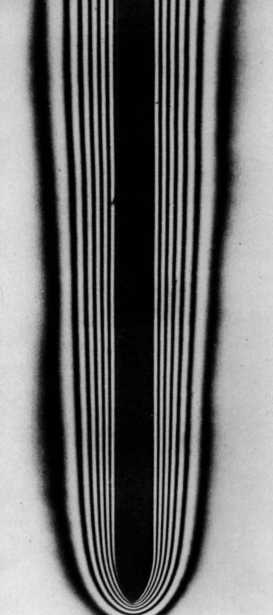 “The plate is uniformly heated in air, producing a steady laminar flow. An interferogram shows lines of constant density which, at nearly constant pressure, are also isotherms. The Grashof number is approximately five million at a distance of 0.1 m from the lower end of the plate, so that the thermal boundary layer is rather thick.” Eckert & Soehngen 1948