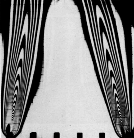 “Electrically heated nichrome wires 18cm long and 7.2cm apart form plumes as in figure 203, which merge by entrainment of the air between” Photograph by Pera & Gebhart
