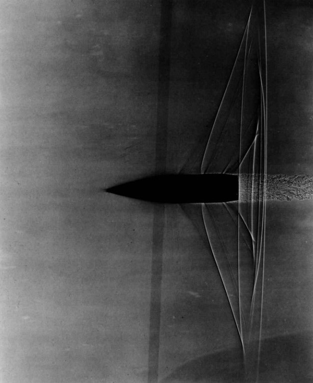 $$ \vcenter{M = 0.990} $$ “Still closer to the speed of sound, the shock-wave pattern of the preceding pages had spread laterally to great distances. These two photographs are from the same firing, so that the second one was actually taken earlier in the trajectory” Photographs by A. C. Charters, in von Kármán 1947